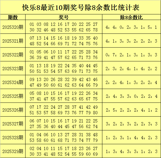 福彩舒畅8第2025329期开奖转头:02 04 10 11 15 17 18 23 26 27 30 33 41 48 52 54 55 59 60 69,其中奖号除8尾数比为1:3:4:3:3:1:2:3。